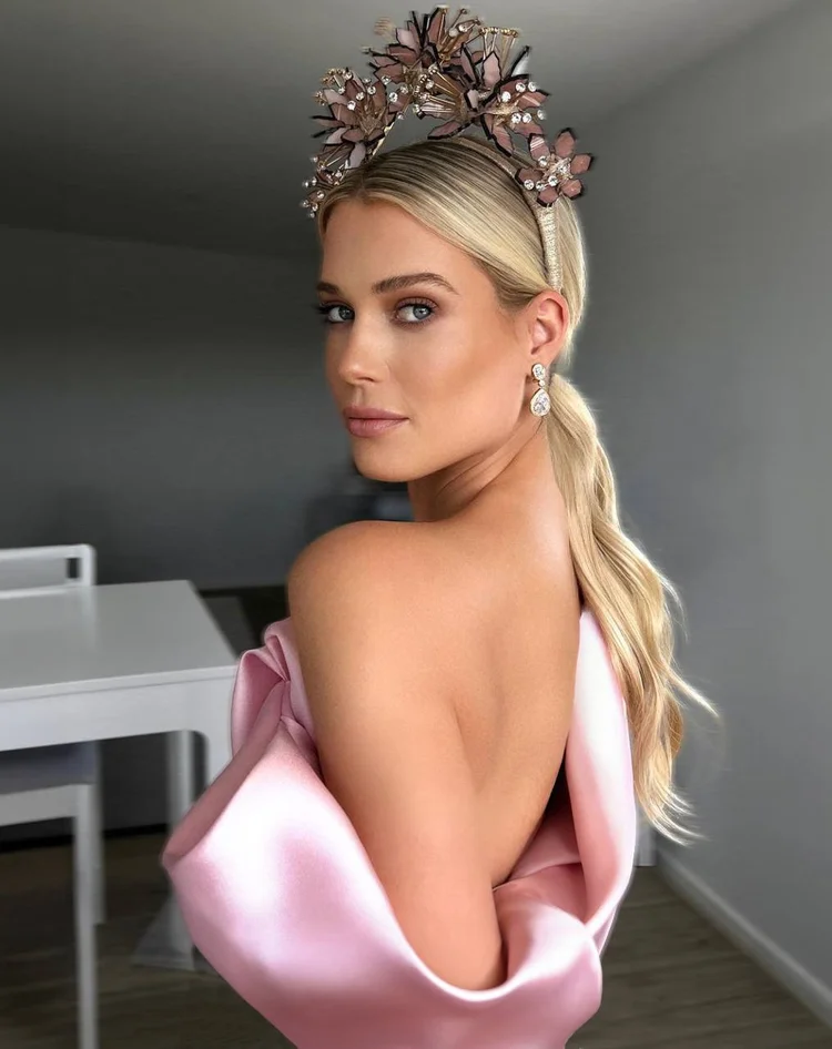 This gown gained national recognition when reinterpreted in baby pink Mikado for Amelia Spencer, who wore it as host of the Melbourne Cup. Her look graced the front pages across Australia, showcasing the gown’s adaptability and timeless appeal.